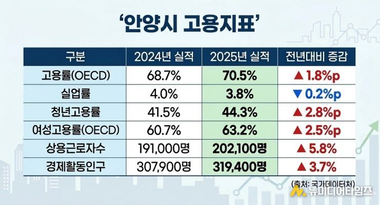 국가데이터처에 따르면, 안양시의 지난해 고용률(OECD)은 70.5%로, 전년 대비 1.8%p 상승했으며, 실업률은 3.8%로 집계돼 0.2%p 하락했다.