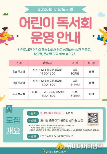광명시 하안도서관은 어린이들이 올바른 독서 습관을 형성하고 기초 문해력을 기를 수 있도록 ‘2026년 어린이 독서회’ 참여 회원을 모집한다.