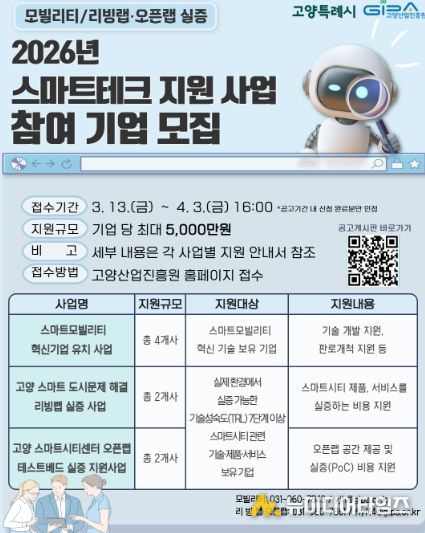 이번 모집은 ▲ 고양 스마트시티센터 오픈랩 테스트베드 실증 지원 사업 ▲ 고양 스마트 도시문제 해결 리빙랩 실증 사업 ▲ 스마트 모빌리티 혁신기업 유치 사업 세 분야로 진행된다.