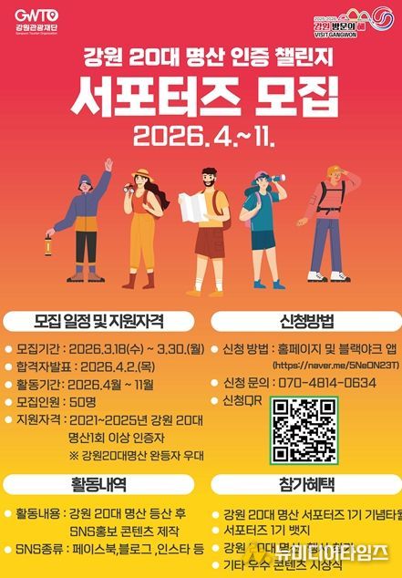 강원특별자치도와 강원관광재단은 지난 3월 18일부터 오는 3월 30일까지‘강원 20대 명산 서포터즈 1기를 모집한다고 밝혔다.