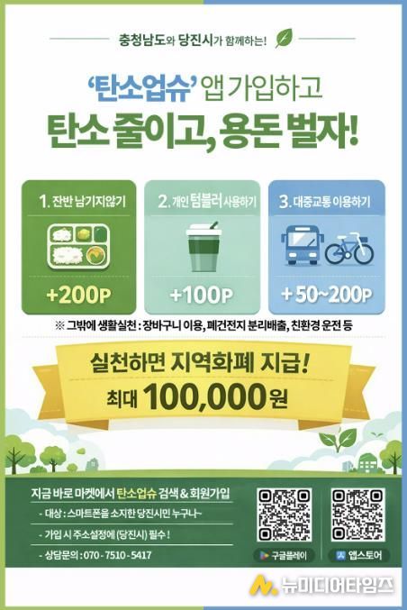 당진시는 기후위기 대응을 강화하고 시민들의 자발적인 탄소중립 실천을 확산하기 위해 충남형 탄소중립포인트제 ‘탄소업슈’ 가입자 확대를 본격 추진한다고 19일 밝혔다.