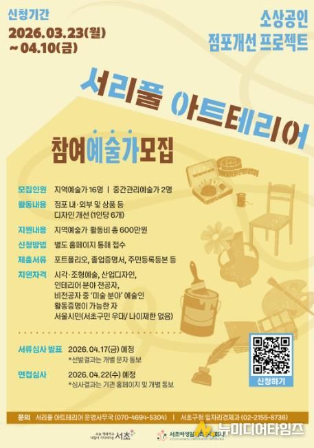 자세한 사항은 서초구청 누리집 공고문에서 확인할 수 있으며, 구는 이후 선정위원회 심사를 거쳐 최종 참여 점포와 예술가를 선정할 계획이다.