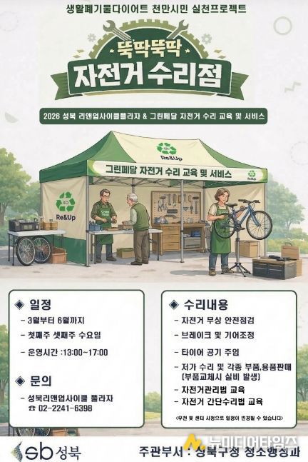 이승로 성북구청장은 “이번 ‘뚝딱뚝딱 자전거 수리점’은 주민들이 부담 없이 자전거를 점검하고 직접 수리 방법까지 배울 수 있는 기회”라며 “앞으로도 자원순환에 동참할 수 있는 다양한 프로그램을 운영해 생활폐기물 감량 실천을 확대해 나가겠다”고 말했다.
