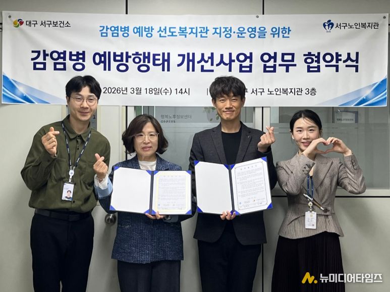 대구 서구보건소는 18일, 서구노인복지관(사회복지법인 가정복지회)을 ‘감염병 예방 선도복지관’으로 지정하고, 원활한 운영을 위한 업무협약을 체결했다.