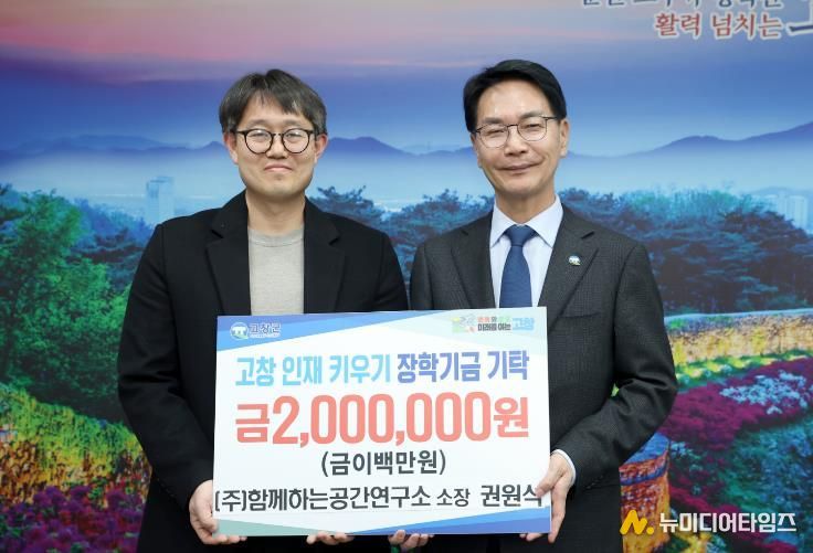 ㈜함께하는공간연구소 권원석 소장이 지난 18일 고창군장학재단에 지역 인재들의 밝은 미래와 성장을 응원하며 장학금 200만원을 전달했다.