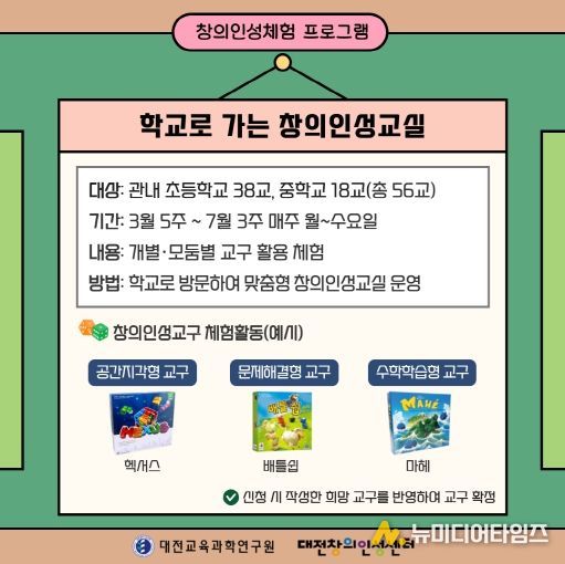 대전교육과학연구원 창의인성센터는 2026학년도 3월 30일부터 매주 월·화·수요일 관내 초·중학교 학생들을 대상으로 ‘학교로 가는 창의인성교실’을 운영한다고 밝혔다.