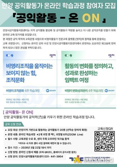 안양시공익활동지원센터가 지역 공익활동가들의 철학적 토대를 다지는 교육을 성공적으로 마친 데 이어, 실천적 전문성을 높이기 위한 온라인 교육 과정을 본격 가동하며 활동가 지원에 박차를 가하고 있다.