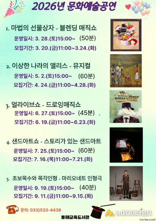 동해교육도서관은 3월 28일부터 9월 19일까지 지역주민을 대상으로 문화예술을 가까이에서 체험할 수 있는 총 5개의 공연을 선보일 예정이다.