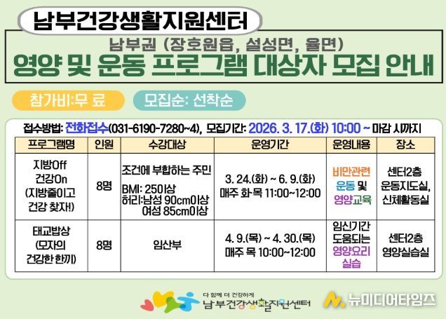 이번 프로그램은 다양한 계층을 대상으로 비만 예방·관리를 지원하는 ‘지방Off 건강On(지방 줄이고 건강 찾자!)’교실과 임산부의 영양 관리를 돕는 ‘태교밥상(모자의 건강한 한 끼)’교실 프로그램을 구성해 2026년 3월 17일부터 신청을 받고 있다.