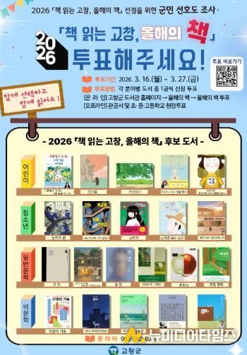 고창군도서관이 오는 27일까지 2026 ‘책 읽는 고창, 올해의 책’ 선정을 위한 군민 선호도 조사를 실시한다고 20일 밝혔다.