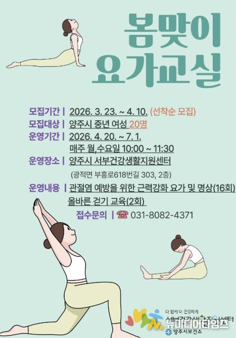 양주시 관계자는 "봄맞이 요가교실을 통해 여성들의 관절 운동 범위 회복과 강직 예방에 도움을 주고, 규칙적인 신체활동을 통해 지역 주민들의 건강한 생활습관을 형성하는 계기가 되길 바란다”고 말했다.