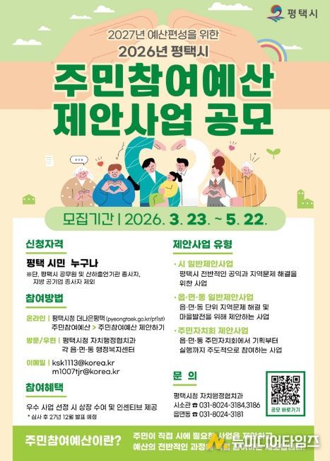 평택시가 3월 23일부터 5월 22일까지 2027년도 예산 편성을 위한 2026년도 주민참여예산 제안사업 공모를 시행한다.