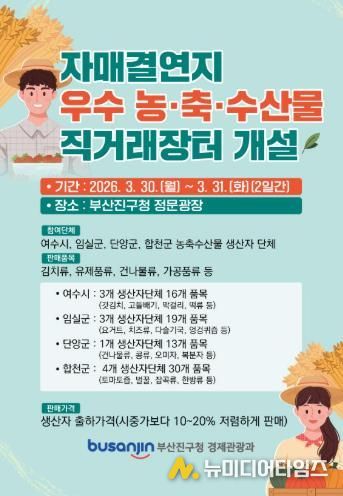 부산진구는 3월 30일부터 31일까지 부산진구 정문광장에서 ‘자매결연지 농축수산물 직거래장터’를 개최한다고 밝혔다.