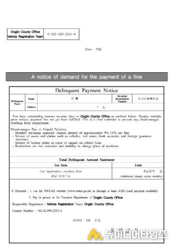 옹진군이 자동차 과태료 외국인 체납자들을 대상으로, 영어로 번역된‘자동차 과태료 체납 안내문’을 발송한다고 밝혔다.