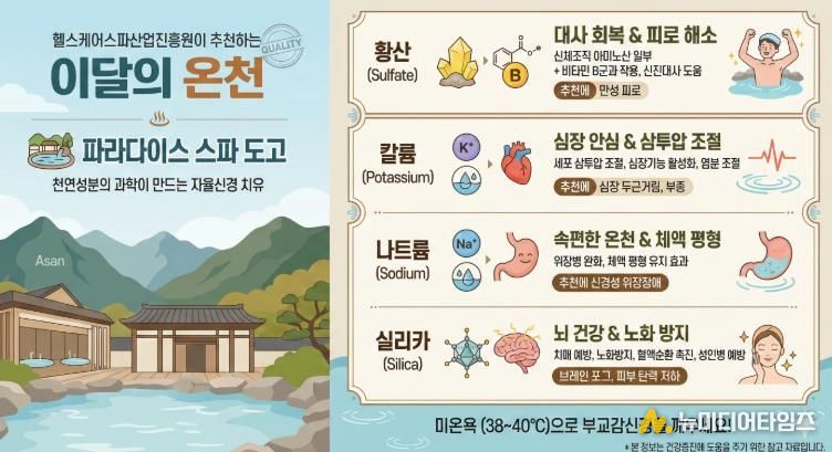 한편, 파라다이스 스파 도고는 이번 이달의 온천 선정을 기념하여 진흥원 권장 입욕법 안내 및 성분별 효능을 담은 인포그래픽을 홈페이지(알림마당 & 진흥원 소식)에 게재하고, 방문객들에게 과학적인 온천 요법을 전파할 예정이다.