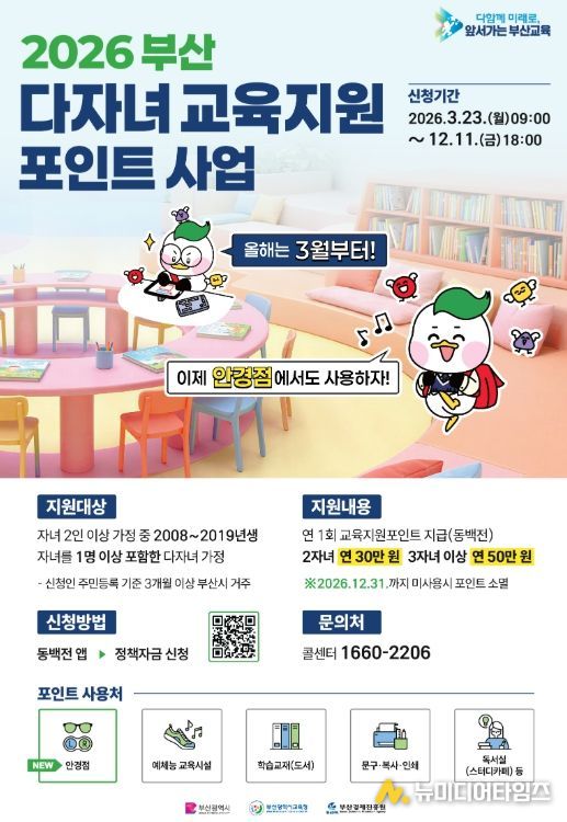 부산광역시교육청은 저출생 문제에 대응하고 학부모의 교육비 부담을 덜어주기 위한 지원책의 하나로 다자녀가정에 지급하는 ‘교육지원포인트’ 신청을 23일부터 접수받는다고 밝혔다.