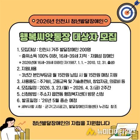 인천광역시는 청년 발달장애인의 자산 형성을 지원하는 ‘행복씨앗통장’사업의 2026년도 대상자 200명을 모집한다.