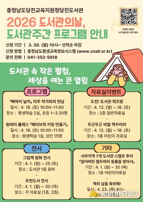 또한 ‘세계 책과 저작권의 날’과 ‘문화가 있는 날’을 기념한 특별 이벤트를 통해 기념품과 간식 제공으로 도서관 이용의 즐거움을 더할 예정이다. 프로그램 신청은 충청남도교육청 평생교육정보시스템을 통해 가능하며, 기타 자세한 사항은 당진도서관으로 문의하면 안내받을 수 있다.