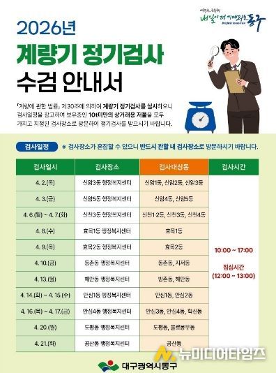 대구 동구청은 오는 4월2일부터 21일까지 ‘2026년 계량기 정기검사’를 실시한다.