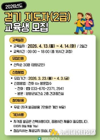양양군보건소가 지역사회 내 자발적인 걷기 실천 분위기를 조성하고 주민 건강 지표를 개선하기 위해 ‘2026년 지역사회 걷기지도자(2급) 양성 과정’을 운영한다.