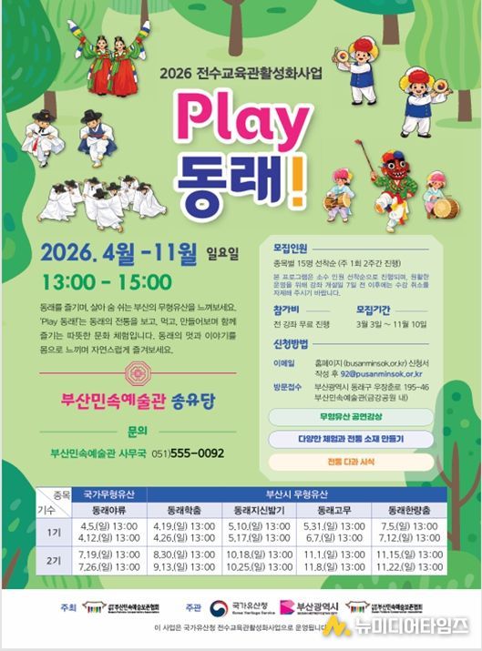 주요 프로그램은 ▲동래야류·동래학춤 등 공연과 체험이 결합한 ‘Play 동래!’ ▲자수·도자·단청 등 장인의 기술을 배우는 전통문화체험교실 ▲초등학생 대상 ‘부산농악 놀이터’ ▲다문화·어린이 참여형 ‘후리소리 전통교실’ 등으로 운영된다.