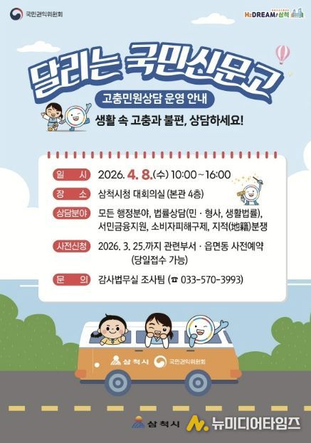 삼척시가 4월 8일 오전 10시부터 오후 4시까지 시청 본관 대회의실에서 국민권익위원회와 함께 ‘달리는 국민신문고’를 운영한다.
