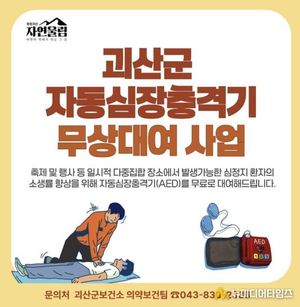 충북 괴산군보건소는 관내 축제와 행사장에서 발생할 수 있는 심정지 사고에 대비해 ‘자동심장충격기(AED) 무상 대여 사업’을 추진한다고 24일 밝혔다.