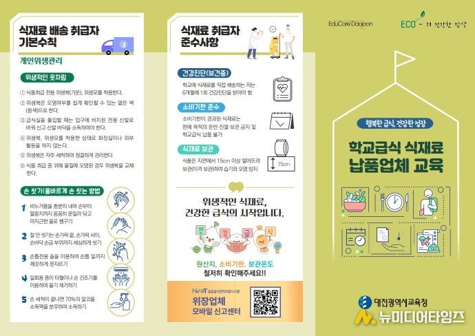 대전시교육청은 안전하고 건강한 학교급식을 위해 학교급식 식재료 공급업체를 대상으로 교육 리플릿을 제작·배부했다고 밝혔다.