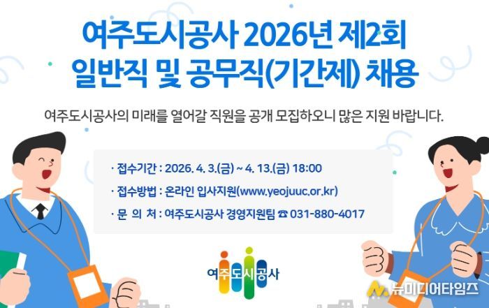 여주도시공사는 공공서비스 품질 향상과 조직 경쟁력 강화를 위해 2026년 제2회 일반직 및 공무직, 기간제 채용을 실시한다고 밝혔다.