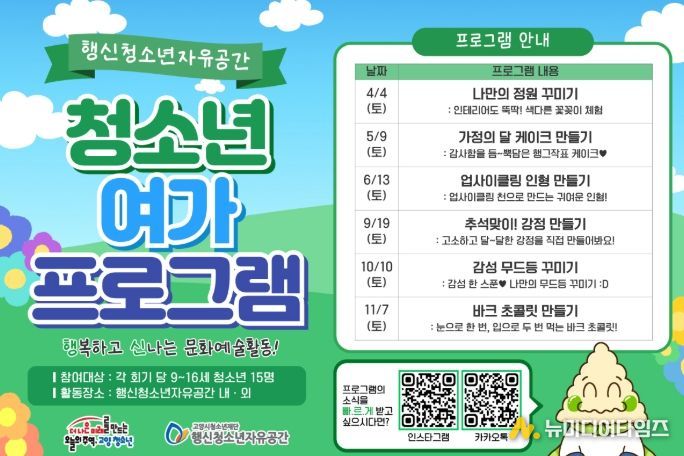 행신청소년자유공간 이재신 센터장은 “청소년들이 일상에서 다양한 문화·예술 활동을 경험하며 건강하게 성장할 수 있도록 지속적으로 지원할 계획”이라며 “앞으로도 청소년의 눈높이에 맞는 다채로운 여가 프로그램을 운영해 나가겠다”라고 전했다.