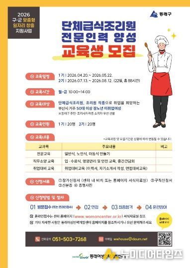 부산 동래구와 동래여성인력개발센터(센터장 이숙련)는 지역 내 50세 이상 장노년을 대상으로 구·군 맞춤형 일자리 창출 지원사업인 ‘단체급식조리원 전문 인력 양성 과정’ 참여자를 모집한다고 24일 밝혔다.