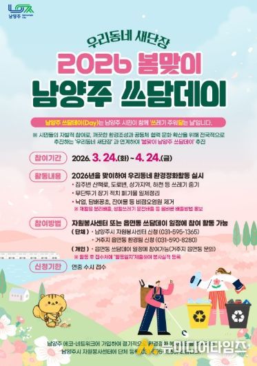 남양주시는 3월 24일부터 4월 24일까지 시 전역에서‘우리동네 새단장 봄맞이 남양주 쓰담데이’집중 추진기간을 운영한다고 밝혔다.