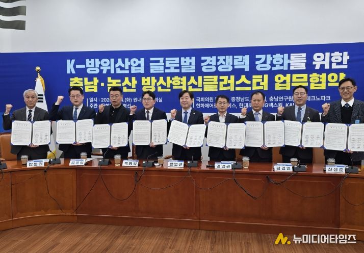 도는 24일 국회에서 황명선 국회의원, 논산시, 한화에어로스페이스·현대로템·LIG넥스원·한국항공우주산업(KAI), 충남연구원·충남테크노파크 등과 업무협약을 체결했다.