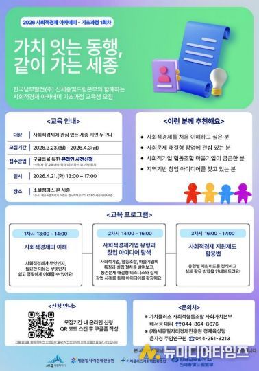 세종일자리경제진흥원이 한국남부발전㈜ 신세종빛드림본부와 협력해 지역 내 사회적경제 인재를 발굴하고 창업을 지원하기 위한 ‘2026 사회적경제 아카데미’를 운영한다.