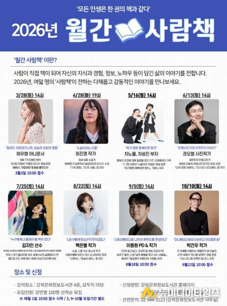 김윤기 강북구도시관리공단 이사장은 “월간 사람책 강연을 통해 서로 다른 삶의 이야기를 나누고 공감하는 가운데, 삶의 가치를 함께 성찰하는 의미 있는 시간이 되길 기대한다”고 말했다.