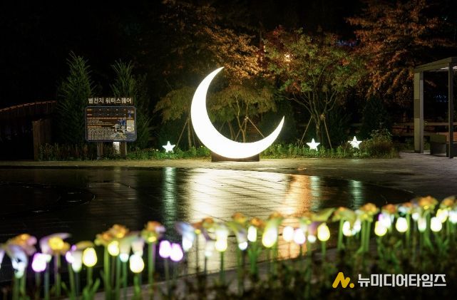 별천지공원과 삼기저수지 일대에 조성된 경관조명이 은은하게 켜지며 낮과는 다른 분위기의 산책로가 펼쳐진다.
