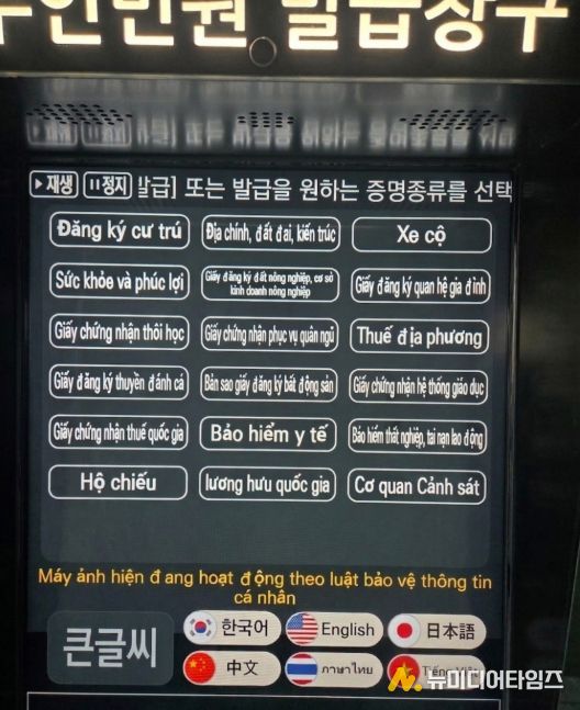 이 서비스는 화면 안내를 번역해 주는 편의 기능으로, 행정 시스템에 지문 등 주민 정보가 등록된 사람(한국 국적 취득자 등)에 한해서만 이용할 수 있다.