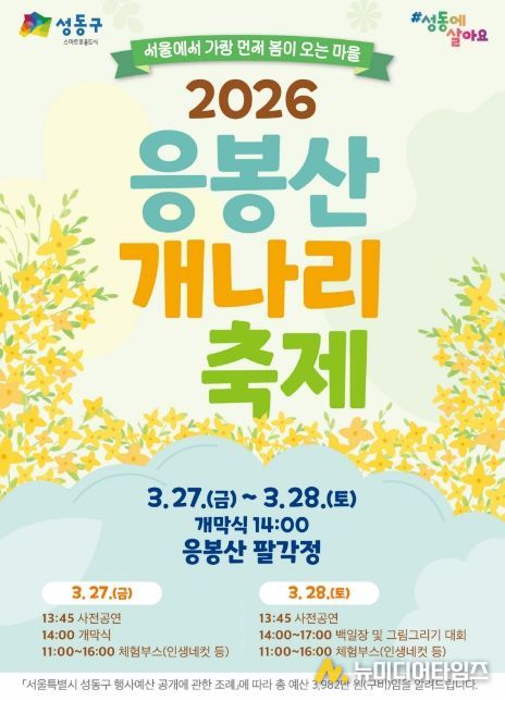 서울 성동구는 오는 3월 27일부터 28일까지 이틀간 봄의 기운을 가득 품은 응봉산에서 ‘2026년 응봉산 개나리 축제’를 개최한다.