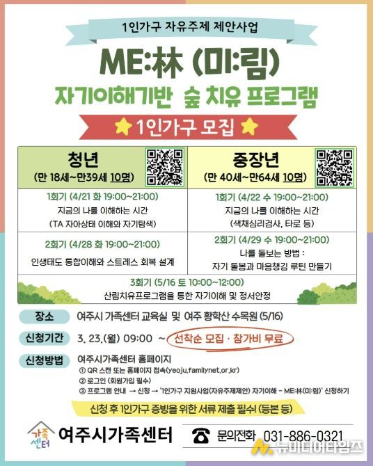 한편, 프로그램은 4월부터 총 3회기에 걸쳐 진행될 예정이며, 청년 1인 가구(만 18세~39세)와 중장년 1인 가구(만 40세~64세)를 대상으로 선착순 모집한다. 신청은 여주시가족센터 홈페이지를 통해 가능하다.