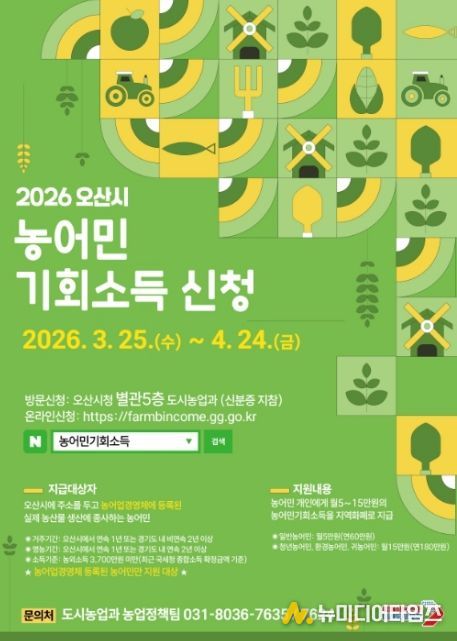 오산시는 농업·농촌의 공익적 가치 보장과 농어촌 소멸위기 대응을 위해 ‘2026년 농어민 기회소득’ 신청·접수를 3월 25일부터 4월 24일까지 진행한다고 밝혔다.