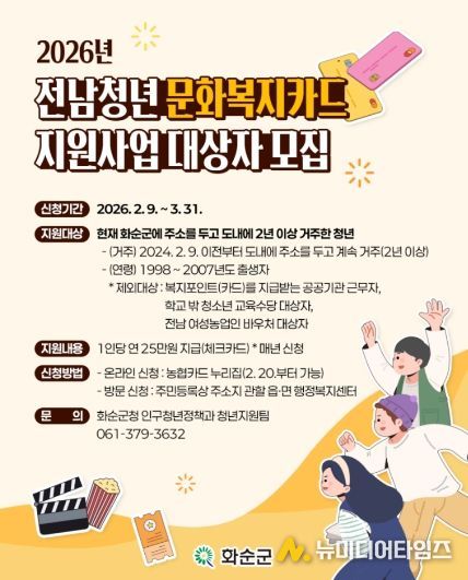 화순군은 지역 청년들의 자기 계발과 문화생활 기회를 확대하기 위해 ‘2026년 전남 청년 문화복지카드 지원사업’ 대상자를 오는 3월 31일까지 모집한다고 밝혔다.