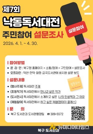 부산 북구는 오는 4월 1일부터 30일까지 한 달간 2026년 제7회 낙동독서대전 개최를 위한 구민 의견수렴 설문조사를 실시한다고 밝혔다.