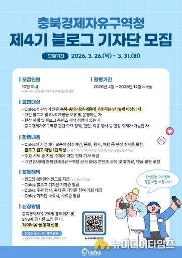 이러한 성공 DNA를 이어받아 충북경제자유구역의 미래 가치를 발굴하고 전파할 제4기 블로그 기자단의 모집 인원은 10명 이내로, 모집 기간은 2026년 3월 26일부터 3월 31일까지 6일간 진행된다.