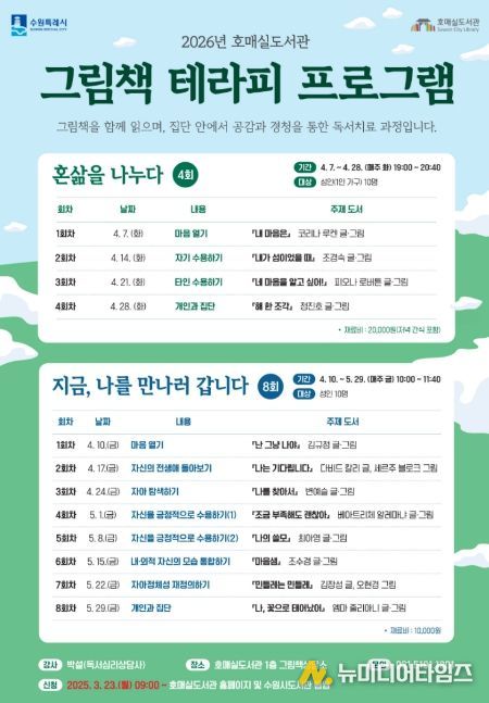 호매실도서관은 4월부터 10월까지 총 20회 그림책 인문치유프로그램 ‘그림책테라피’도 운영한다. 전문 독서심리상담사와 함께 그림책을 읽고 소통하며 정서 회복과 관계 회복을 돕는다.