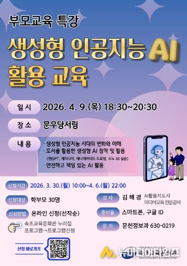 속초교육문화관은 4월 9일 오후 6시 30분, 지역 서점 문우당서림 2층에서 2026년 부모교육 특강 ‘생성형 인공지능(AI) 활용’을 운영한다.