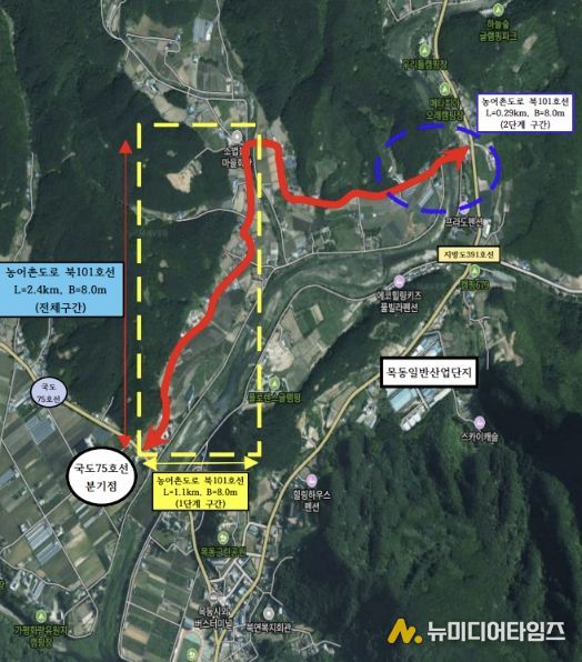 북101호선은 북면 제령리 목동교회 인근에서 소법리 골말교 인근까지 이어지는 총 2.4km 구간이다. 1단계 사업은 2023년 12월 준공과 함께 도로를 개통했으며, 군은 2024년부터 2단계 구간 노선 지정을 위한 행정절차를 진행해 왔다. 이어 올해 1월 보상 협의를 완료하면서 4월 공사 착공을 앞두게 됐다.