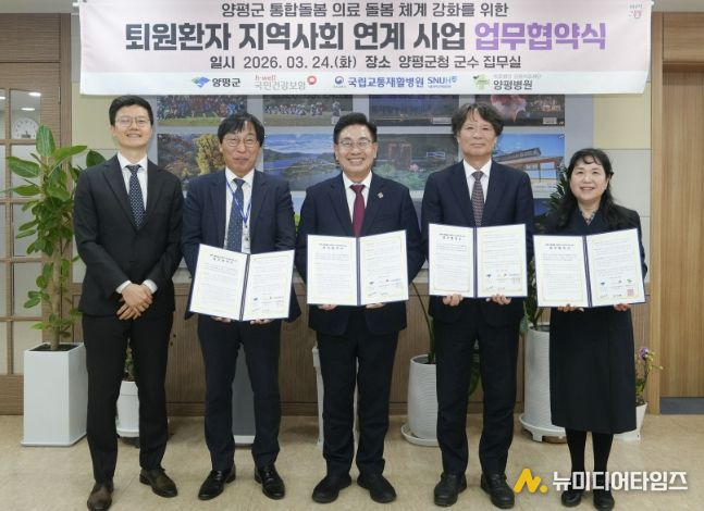 양평군은 지난 24일 군수실에서 국민건강보험공단 양평지사, 국립교통재활병원, 양평병원과 ‘퇴원환자 지역사회 연계 사업’ 추진을 위한 업무협약을 체결하고 의료·돌봄 통합체계 구축에 나섰다고 밝혔다.