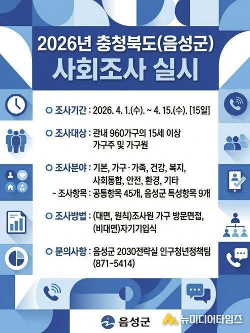 음성군은 오는 4월 1일부터 15일까지 15일간 관내 표본 960가구의 15세 이상 가구주 및 가구원을 대상으로 ‘2026년 충청북도(음성군) 사회조사’를 실시한다.