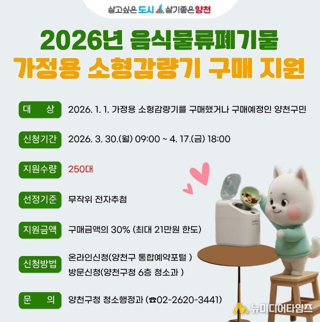 신청 대상은 공고일(2026. 3. 9.) 기준 양천구에 주민등록이 되어 있고, 2026년 1월 1일 이후 가정용 음식물쓰레기 소형 감량기를 구매했거나 구매 예정인 구민이다.