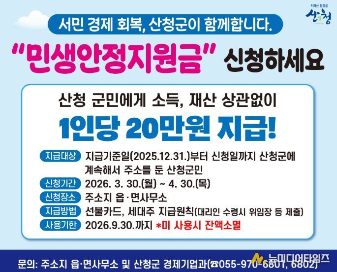 대상은 2025년 12월 31일부터 신청일까지 산청군에 계속해서 주민등록을 두고 있는 군민으로 1인당 20만원 선불카드 형태로 지급한다.